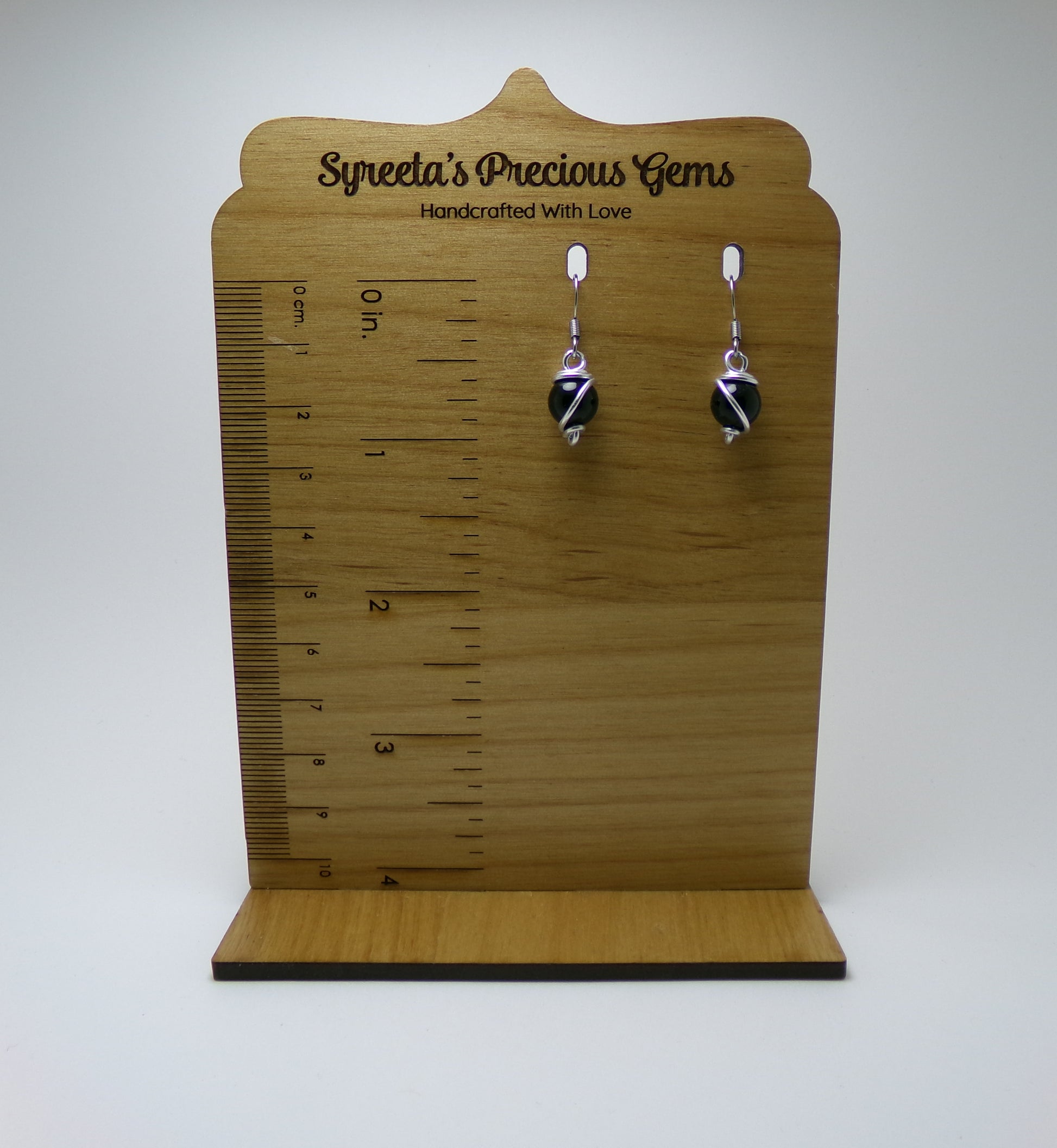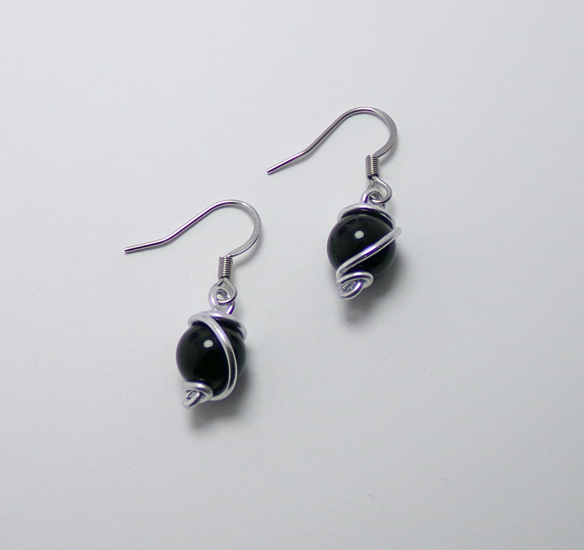 These handmade earrings feature black onyx beads wrapped in aluminum wire. The wire-wrapped swirl design adds a unique touch and ensures that the beads stay securely in place. The aluminum wire also makes the earrings lightweight and comfortable for everyday wear.