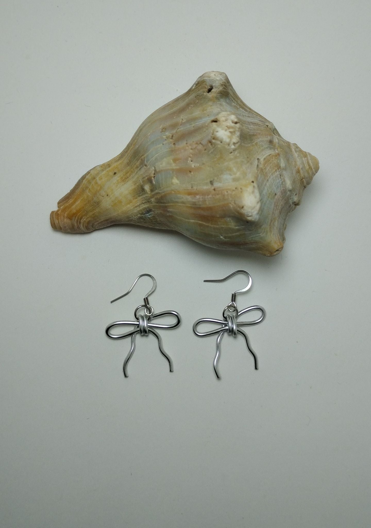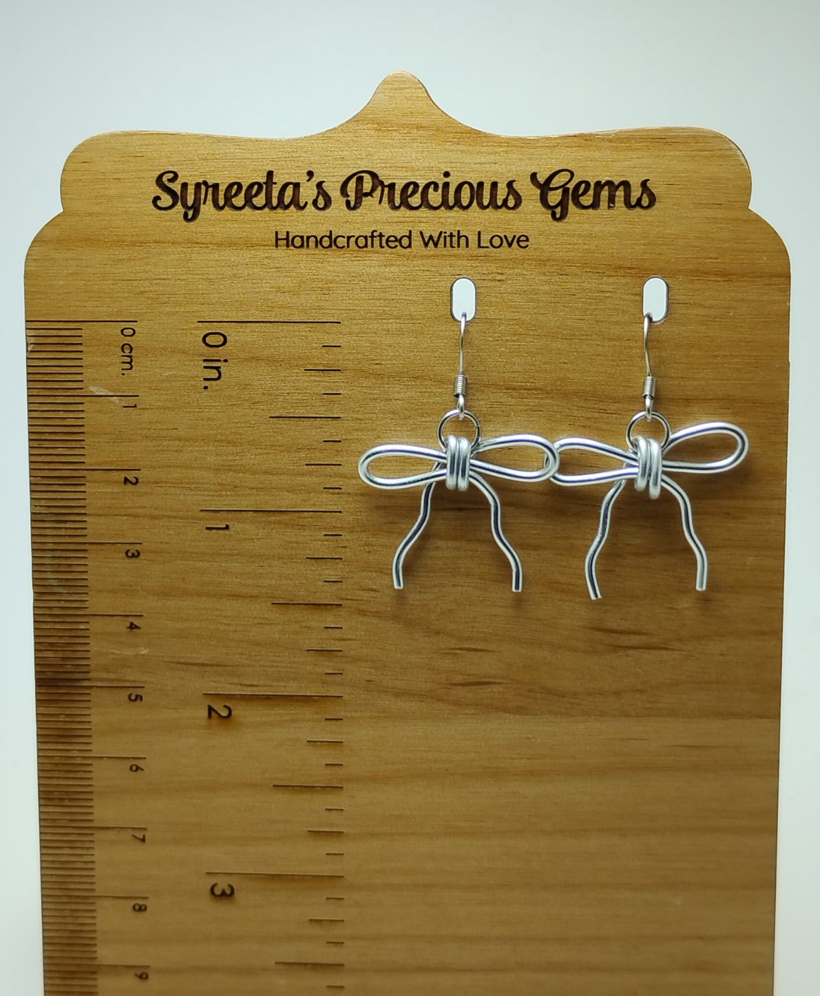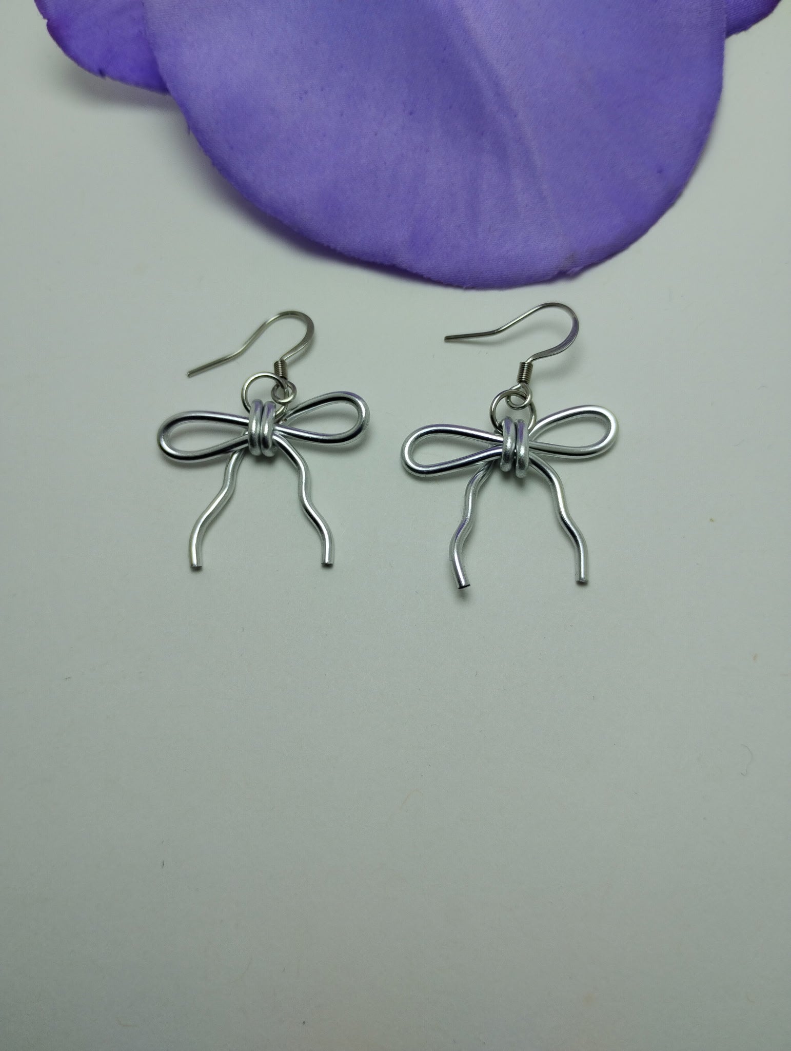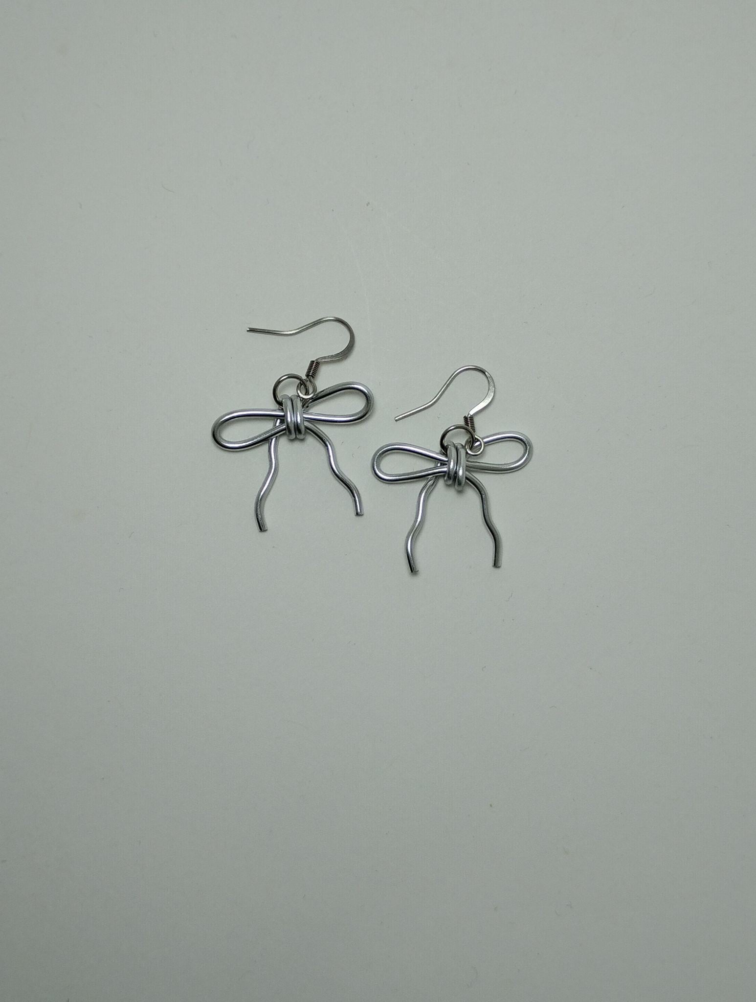 Add a touch of charm to your look with these adorable bow-shaped earrings, handcrafted from non-tarnish aluminum wire. Delicately formed into a sweet bow design, these earrings are lightweight, eye-catching, and perfect for any occasion. Finished with stainless steel earwires, they’re gentle on sensitive ears and made to last. They measure just under 1.5 inches long, making them perfect for adding a subtle statement to your everyday style.