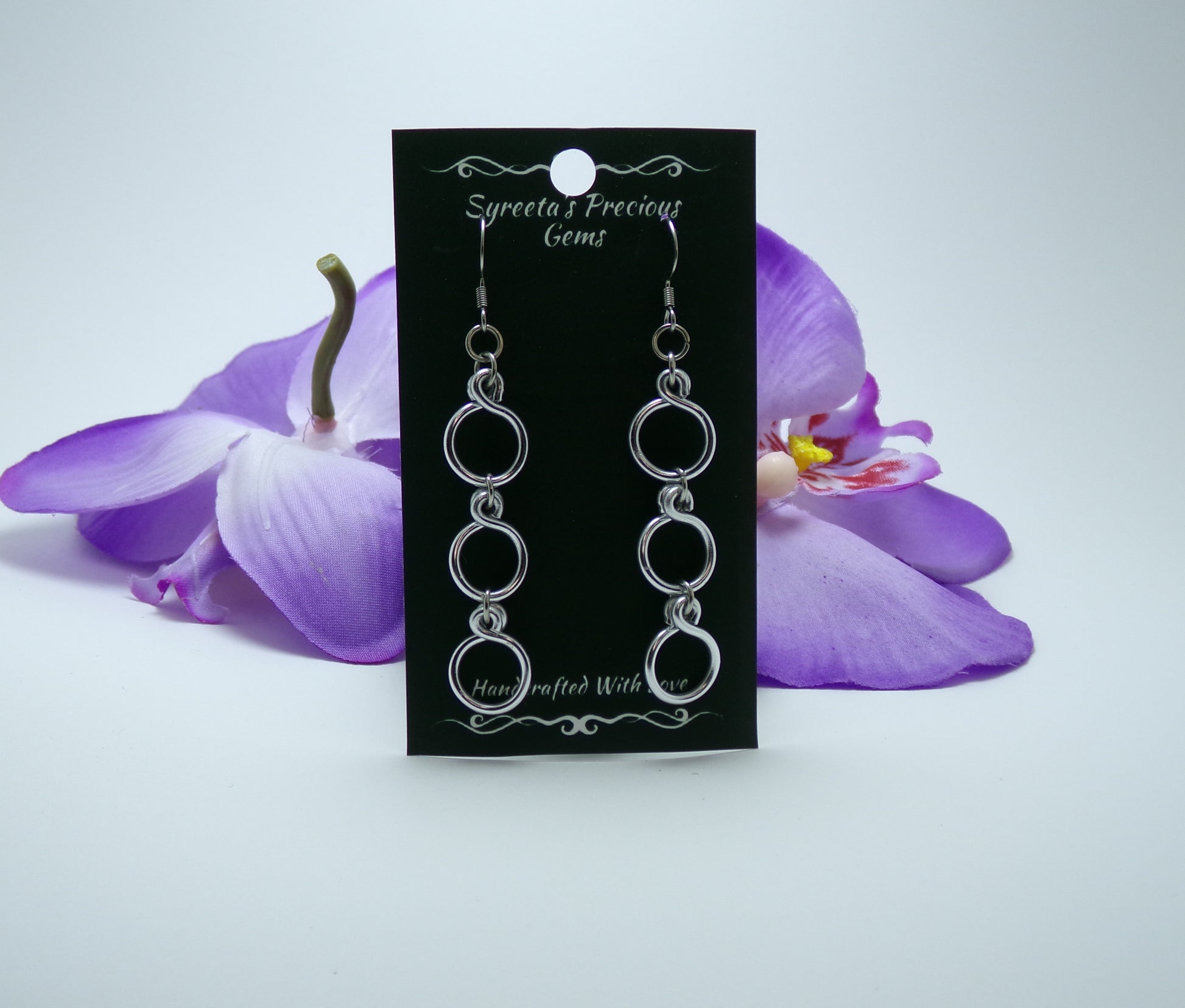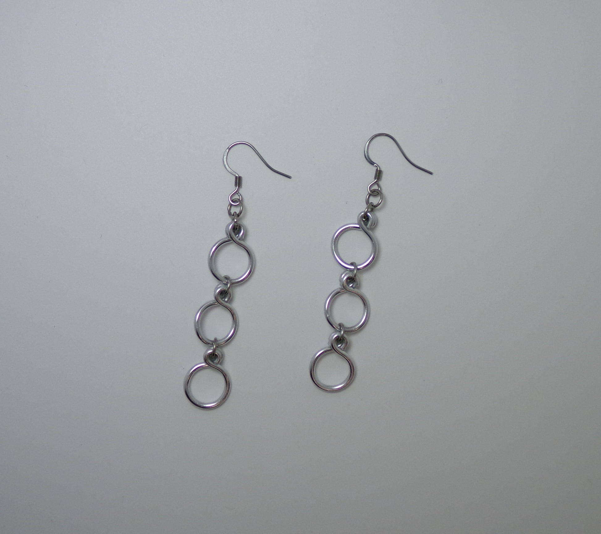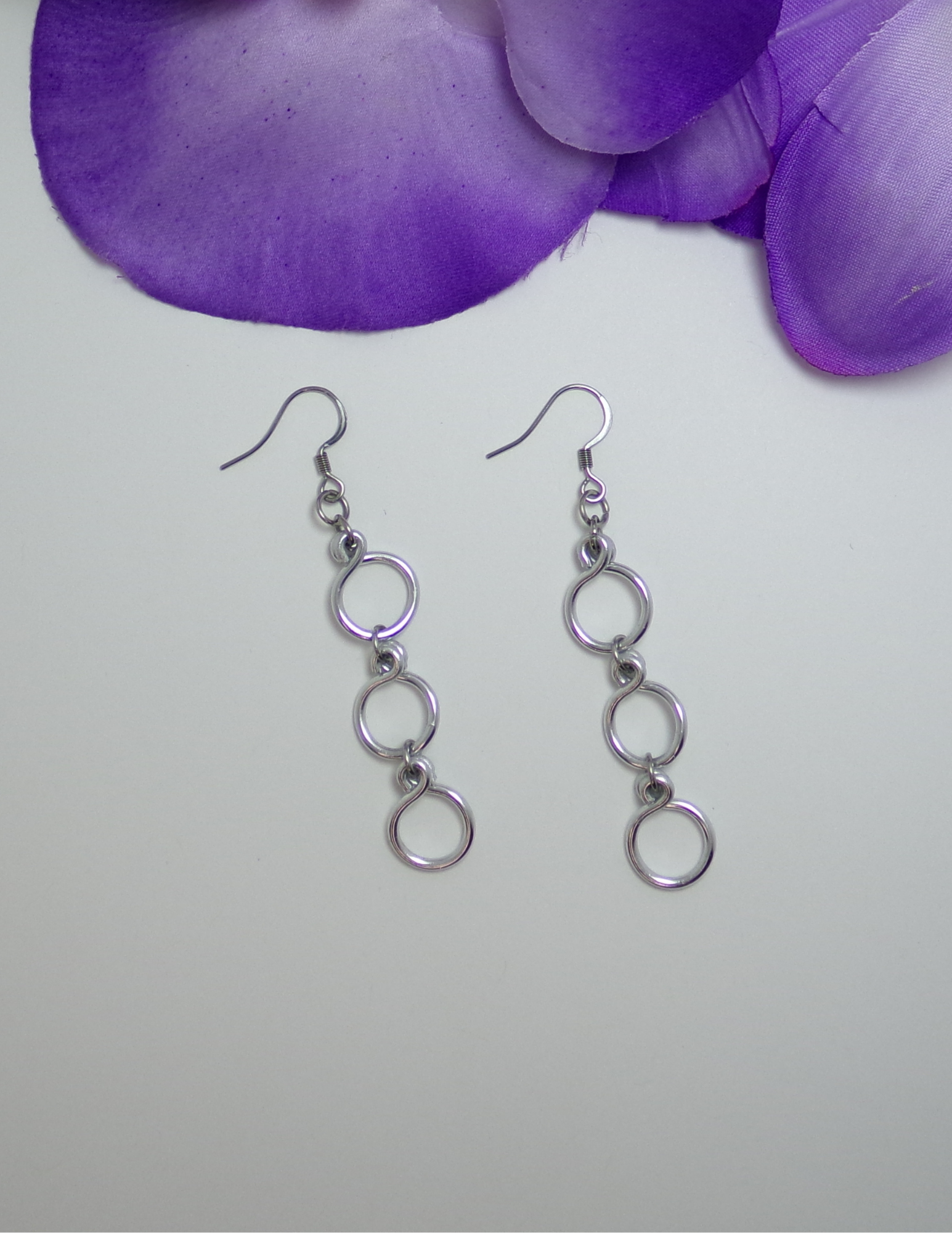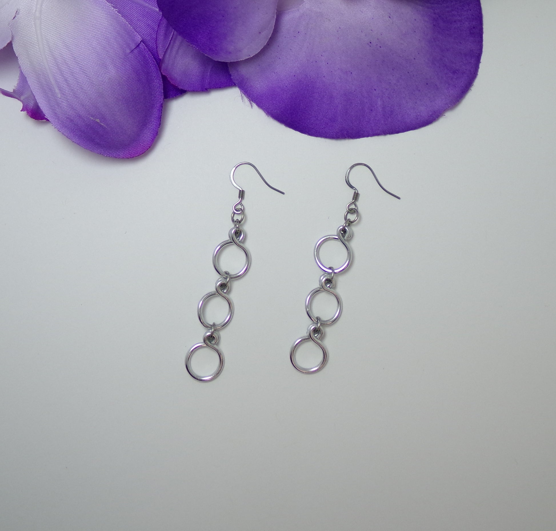 These beautifully crafted Dangle Earrings feature 3 circles, handmade with lightweight, non-tarnish wire. The stainless steel ear wires provide comfort and measure 2.5 inches long. Perfect for adding a touch of elegance to any outfit.