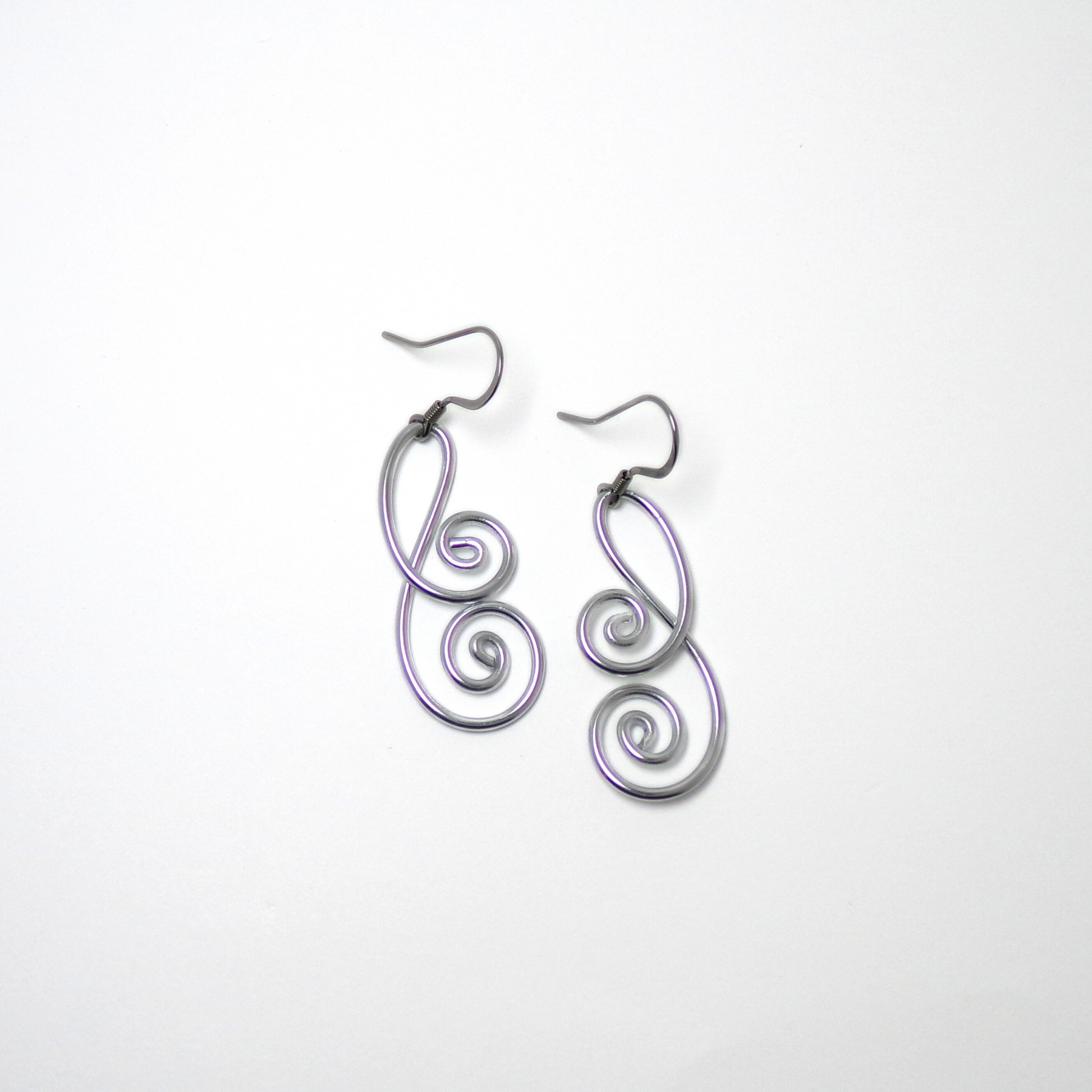 These handmade earrings feature a double swirl design crafted from lightweight aluminum wire. The swirls create a playful and elegant look that is perfect for any occasion.