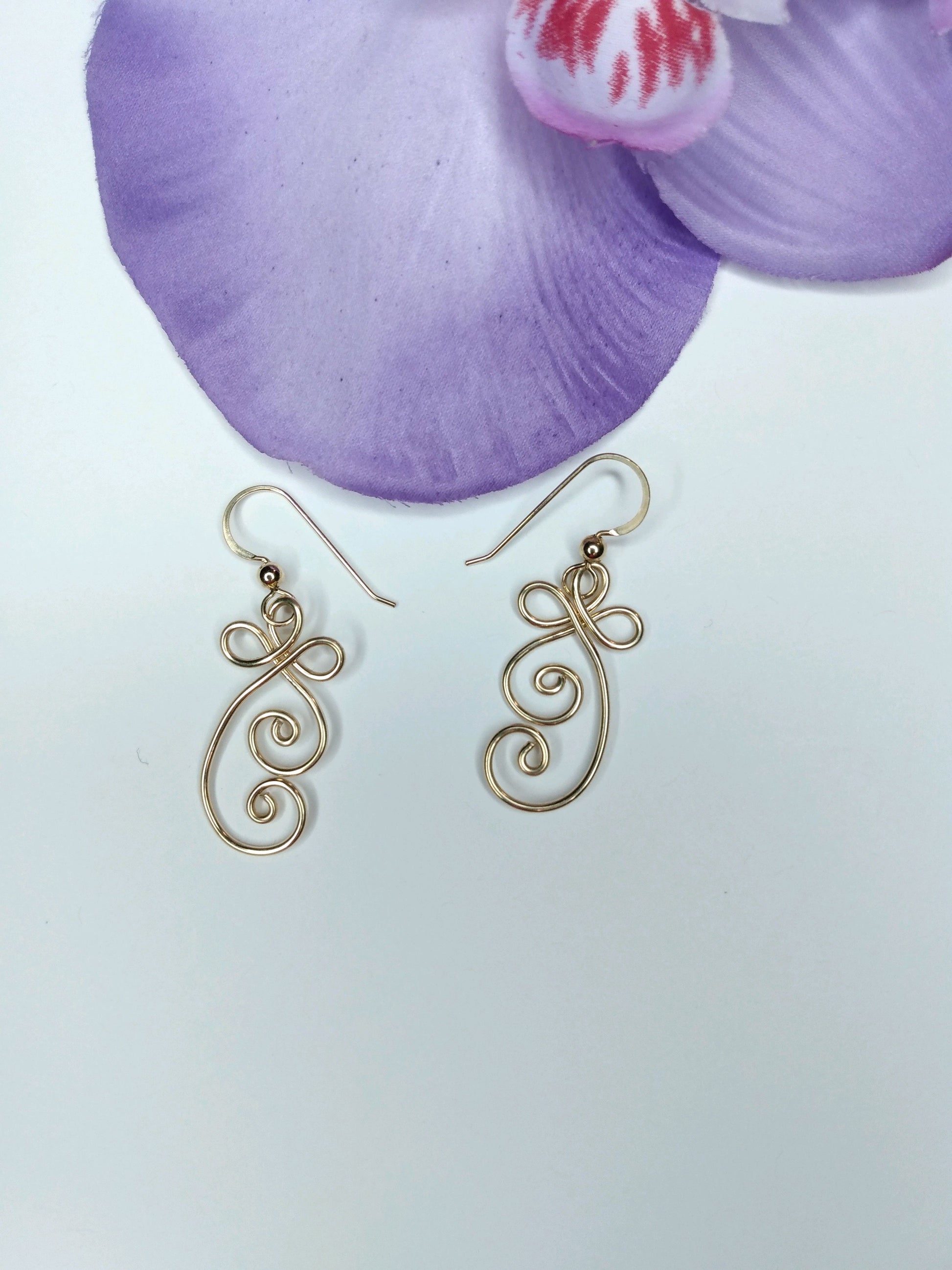 Expertly crafted by hand using 14k gold-filled wire, these earrings feature a unique double swirl design that adds a touch of elegance to any outfit. At 1.75 inches long, they make a statement without being overwhelming. Elevate your style with these beautifully designed earrings.