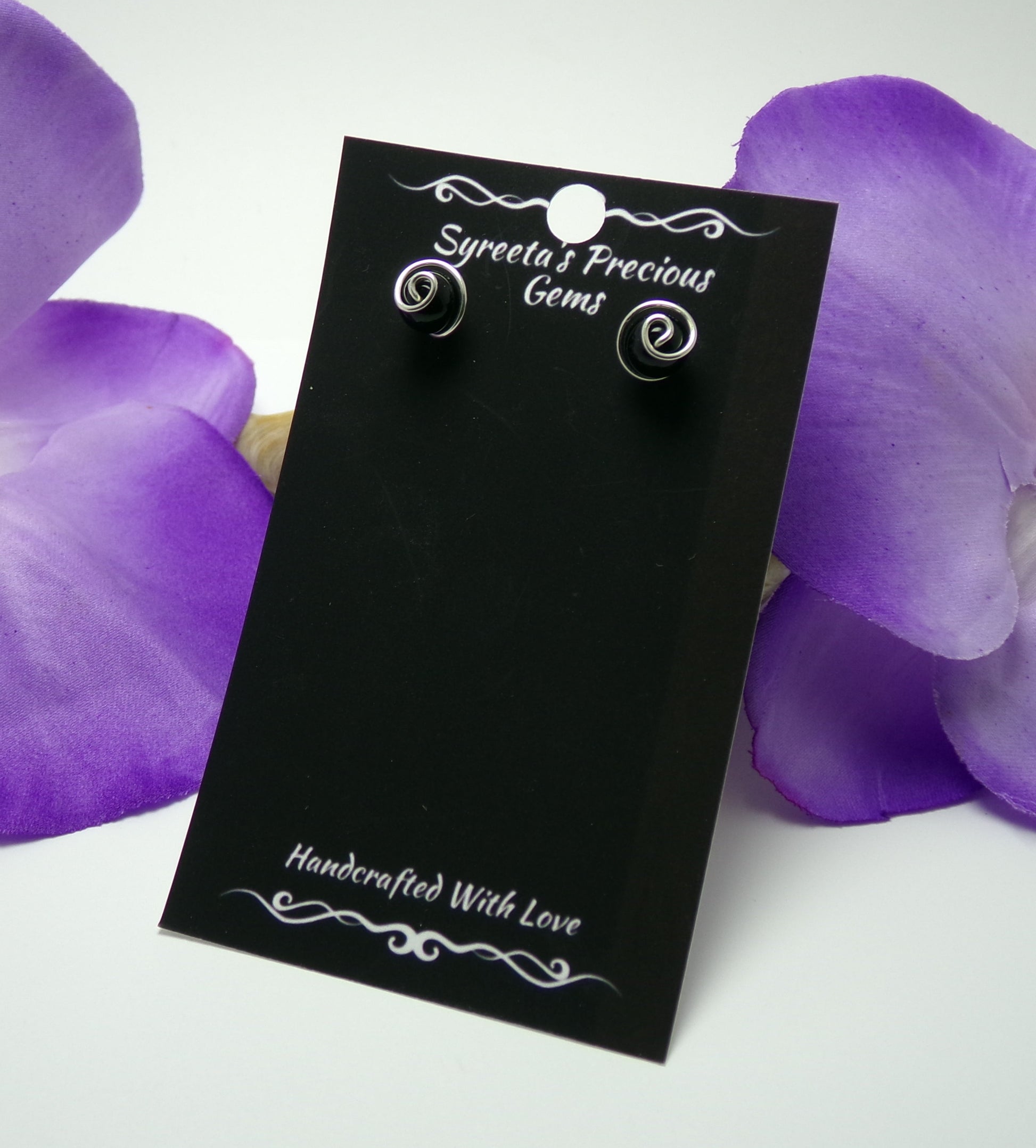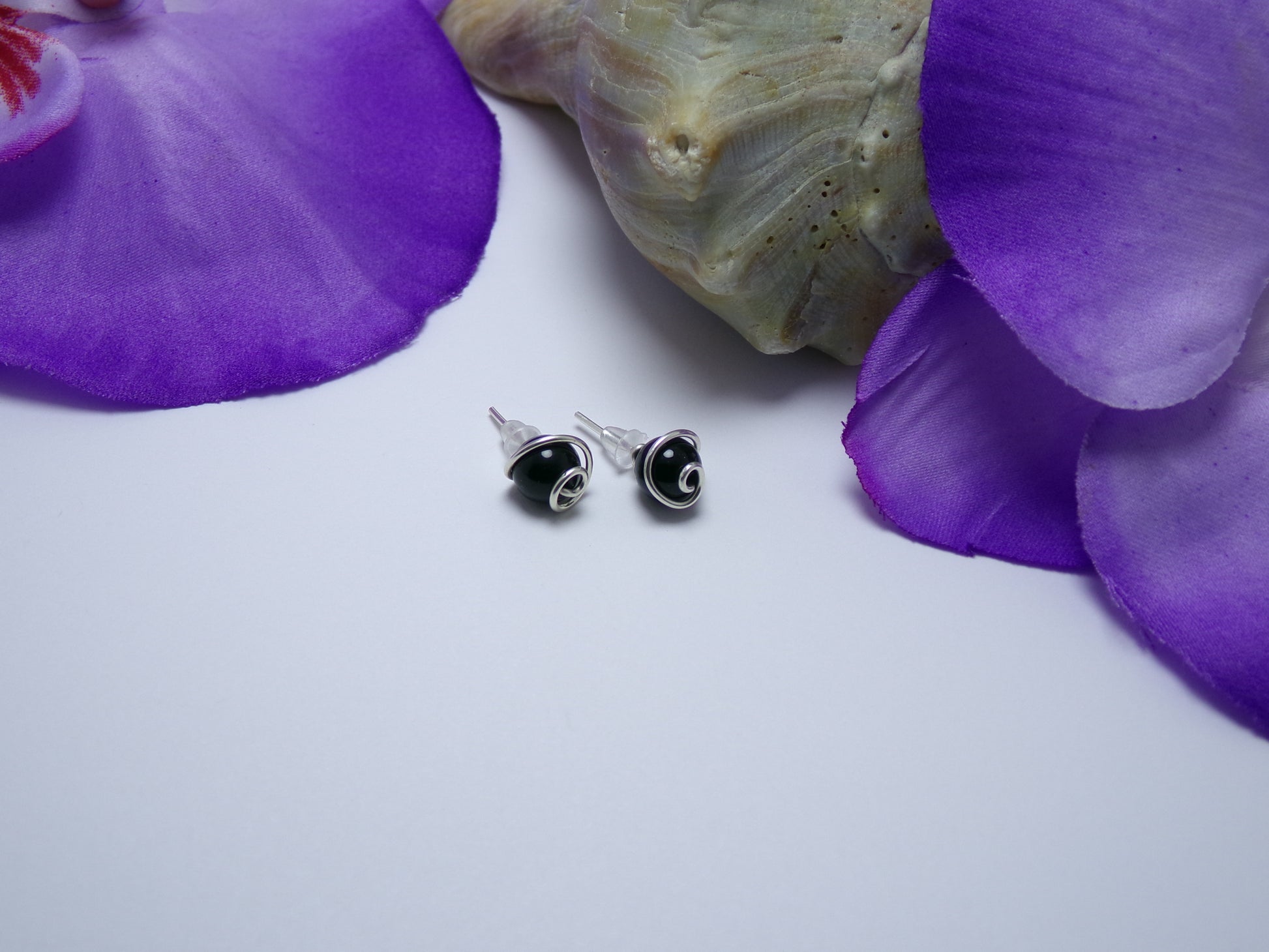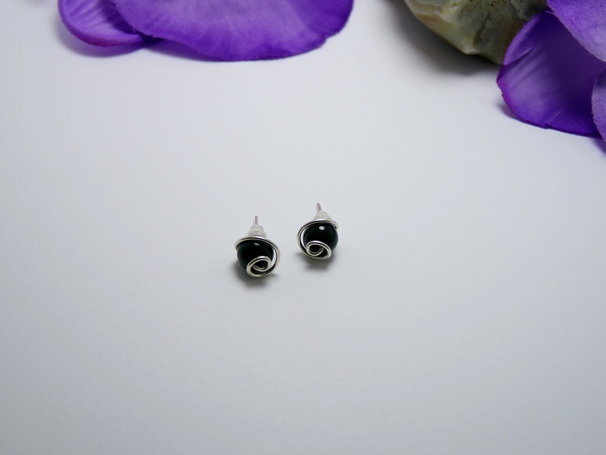 These handmade sterling silver wire studs feature striking black onyx beads and a unique swirl design. The studs have been carefully crafted to ensure a secure fit and comfortable wear.