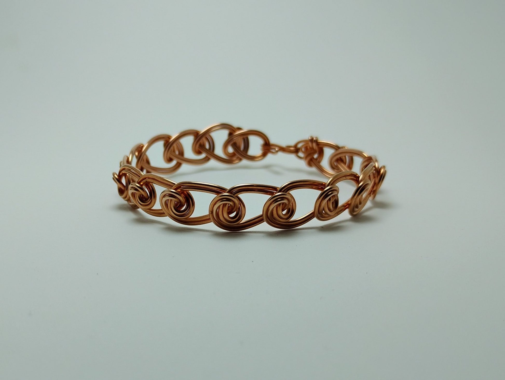This wire cuff bracelet is handmade using bare copper wire and stands out with its unique pattern. Its eye-catching design makes it a one-of-a-kind accessory. Choose from a range of sizes for the perfect fit.