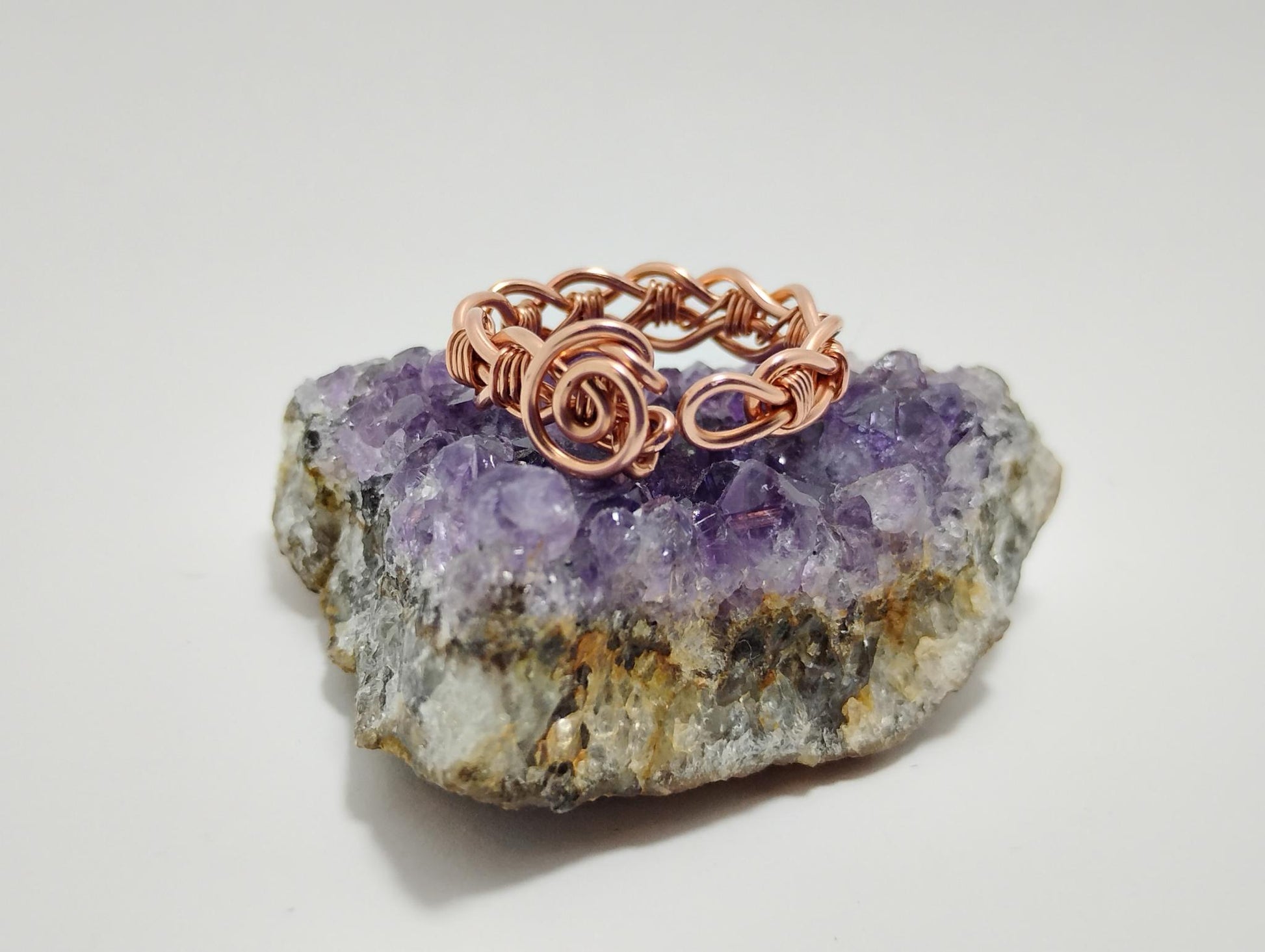 This handcrafted copper ring exudes a unique design. Made with high-quality copper wire, each ring is carefully shaped by hand to ensure durability and charm. Though available in various sizes, it can be gently adjusted for the perfect fit. Its eye-catching curves make it a standout accessory that can be worn on either finger, but looks especially great as a stylish thumb ring.